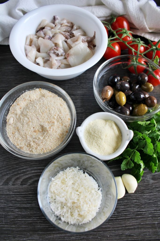 Ich habe mit der Zubereitung begonnen, indem ich die Tintenfische gereinigt und in Ringe geschnitten habe. Ich habe sie trocknen lassen und dann in einer Panade aus Semmelbröseln, Hartweizengrieß, geriebenem Parmesan, gehackter Petersilie und Knoblauch gewendet. Ich habe sie in eine mit Backpapier ausgelegte Form gelegt, zusammen mit in Viertel geschnittenen Kirschtomaten und grünen und schwarzen Oliven.