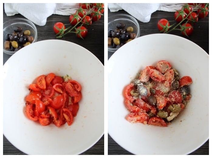 • Waschen Sie in der Zwischenzeit die Kirschtomaten, schneiden Sie sie in Hälften oder Viertel und würzen Sie sie mit der Panade aus Semmelbröseln, Grieß, Petersilie und Knoblauch, zusammen mit den Oliven.