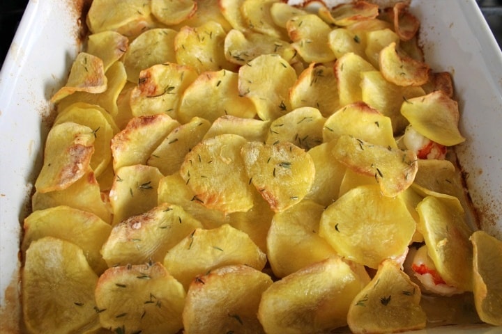 Im Ofen gebratener Lachs mit Kartoffeln und Garnelen, ein raffiniertes und sehr schmackhaftes Hauptgericht. Hervorragend als Hauptgericht oder auch als Einzelgericht, ideal für besondere Anlässe oder ein formelles Mittagessen.