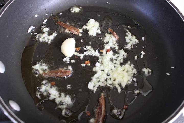 Zuerst erhitzen Sie in einer großen Pfanne 3 Esslöffel extra natives Olivenöl, fügen die fein gehackte Zwiebel + 1/2 Knoblauchzehe mit einem manuellen Zerkleinerer (praktisch und schnell) hinzu und lassen sie ein paar Minuten anbräunen, zusammen mit einer ganzen Knoblauchzehe, dann fügen Sie die Sardellen hinzu (drücken Sie sie nach und nach mit einem Holzlöffel, um sie aufzulösen), die Kapern und eine Prise Chili und lassen Sie sie leicht anbraten, etwa 2 – 3 Minuten.