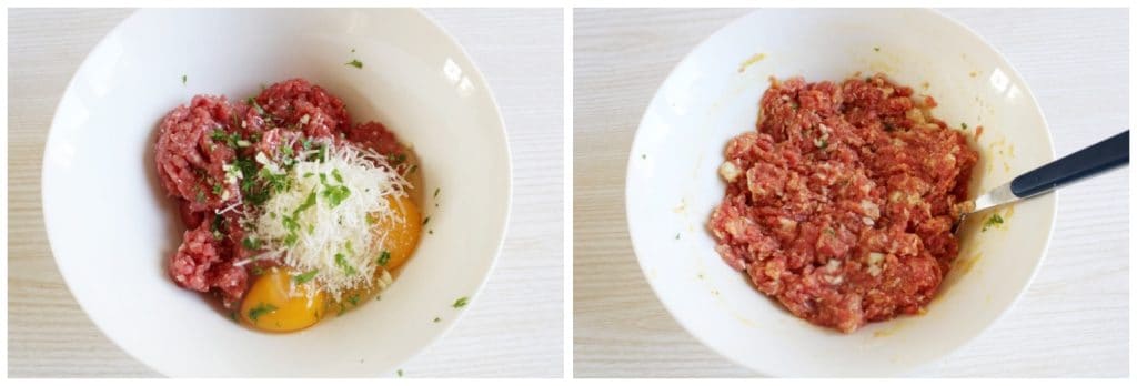 In einer anderen Schüssel das Fleisch, das Ei, den geriebenen Parmesan, den Knoblauch und die gehackte Petersilie, Salz und Pfeffer hinzufügen. Das eingeweichte Brot gut ausdrücken, um überschüssige Milch zu entfernen, und es zur Fleischmischung hinzufügen.