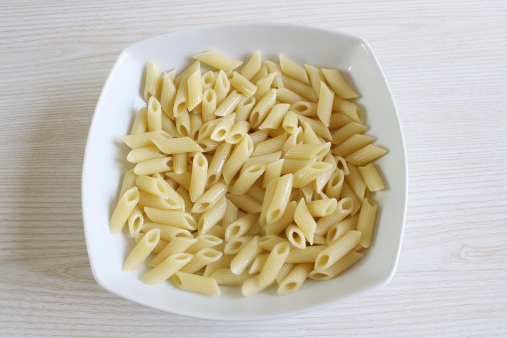• Zuerst stellt ihr einen Topf mit reichlich Wasser auf den Herd und bringt es zum Kochen. Wenn das Wasser kocht, fügt die Penne (oder die Form von kurzer Pasta, die ihr bevorzugt) hinzu und kocht sie al dente für mindestens 9 – 10 Minuten (je nach Anleitung auf der Packung).