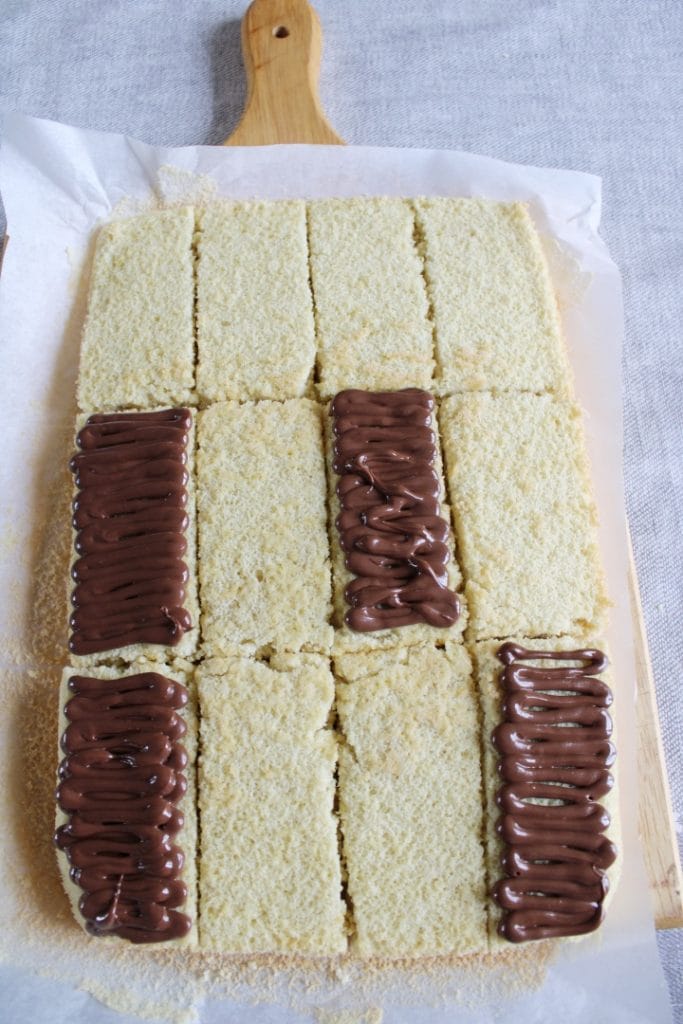 Erwärmt die Nutella für ein paar Minuten in der Mikrowelle, gebt sie in einen Spritzbeutel und füllt 6 Rechtecke.