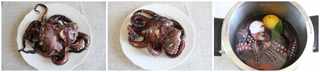 Zuerst den Oktopus kochen: Wasser in einem Topf erhitzen; wenn es kocht, salzen, den Oktopus für 2 – 3 Mal hinein- und herausheben, indem Sie ihn am Kopf halten. Dieser Vorgang dient dazu, die Tentakel zu kräuseln. Dann im Wasser lassen, die Knoblauchzehe,Lorbeerblätter, eine halbe Zitrone hinzufügen und mindestens 50 – 60 Minuten kochen lassen.
