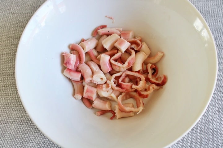 Dann abtropfen lassen, den Kopf von den Tentakeln trennen, Schnabel und Augen entfernen; Tentakel in Scheiben schneiden und den Kopf in Juliennestreifen mit einem scharfen Messer (oder mit einer Schere) schneiden.