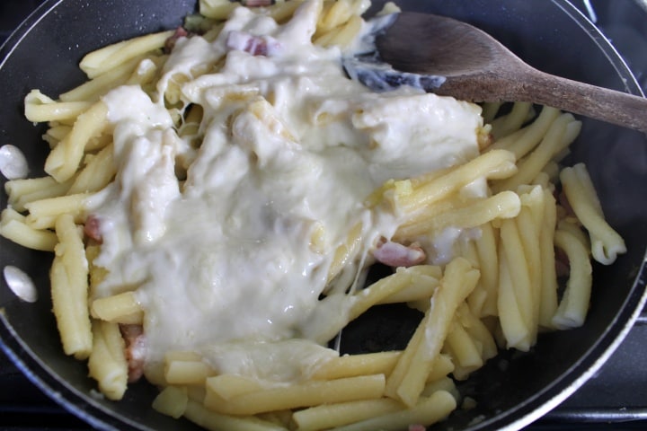• Sobald die Pasta gekocht ist, gießen Sie sie ab al dente und geben Sie sie in die Pfanne mit dem Speck und den Kartoffeln (bewahren Sie 1 Esslöffel Speck und Kartoffeln auf), falls nötig, fügen Sie etwas Kochwasser hinzu), vermischen Sie und lassen Sie es einige Minuten sautieren, um alles gut zu vermengen.