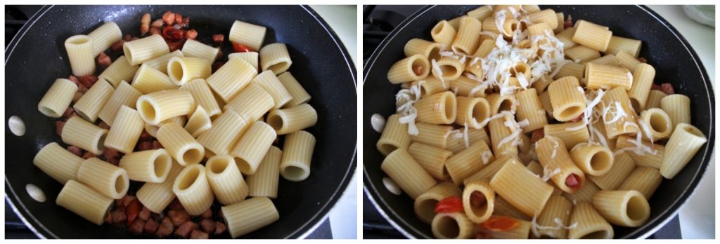 Das Rezept für die Pasta mit Speck, Kirschtomaten und Scamorza, das ich Ihnen vorschlage, wird mit Mezzi Rigatoni zubereitet, aber Sie können es durch jede andere Art von Pasta ersetzen, die Sie bevorzugen, obwohl ich empfehle, kurze und geriffelte Pasta (damit sie die Sauce besser aufnimmt) wie Penne, Farfalle, Fusilli zu verwenden.
