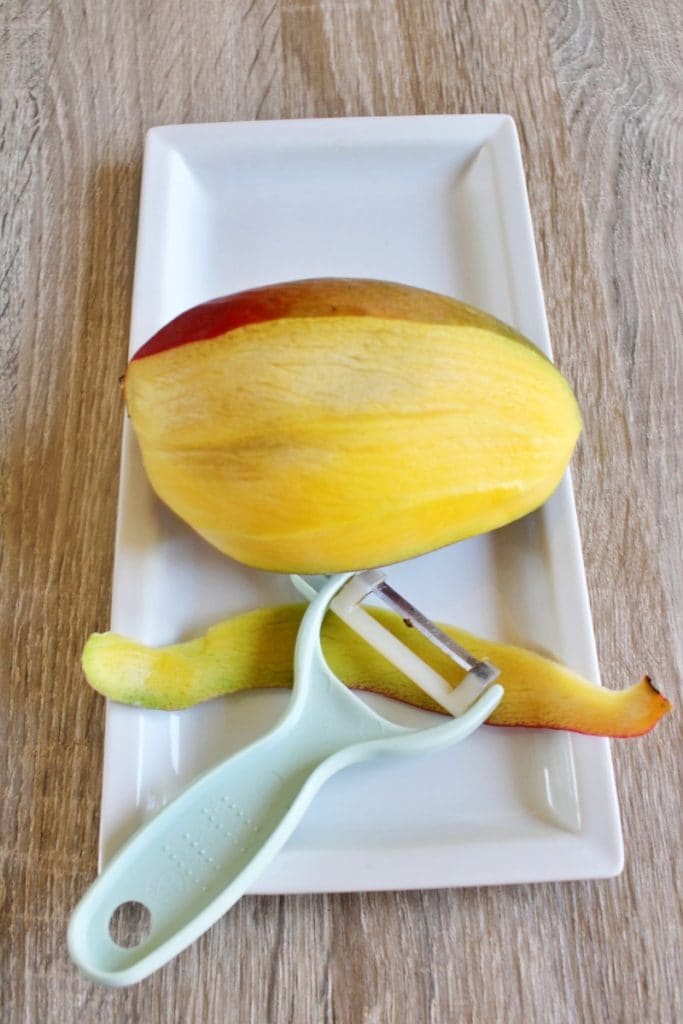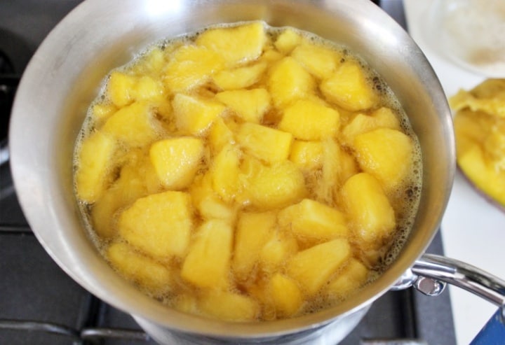 • Zuerst die Pfirsiche und den Mango schälen und in Stücke schneiden. In der Zwischenzeit einen Topf mit Wasser auf den Herd stellen, das Obst sowie den Zucker hinzufügen und zum Kochen bringen.