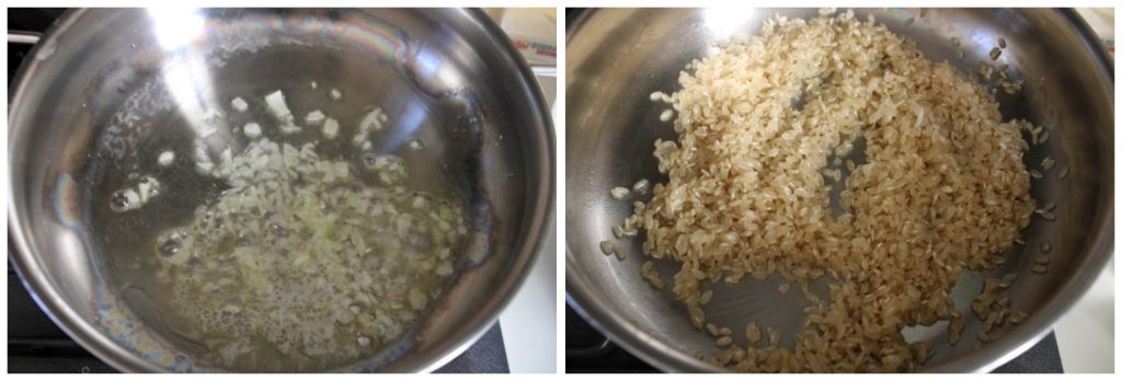 • Zuerst eine Kasserolle auf den Herd stellen mit 20 g Butter, extra nativem Olivenöl, die gehackte Zwiebel hinzufügen und einige Minuten bei starker Hitze anschwitzen lassen, dabei mit einem Holzlöffel umrühren. Wenn die Zwiebel weich geworden ist, den Reis hinzufügen und anrösten, dabei gelegentlich umrühren.