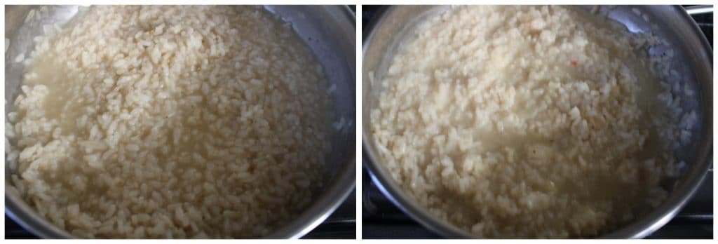 • Mit Weißwein ablöschen und verdampfen lassen. Wenn der Wein getrocknet ist, die Garzeit fortsetzen, indem nach und nach die heiße Brühe hinzugefügt wird und gelegentlich umgerührt wird, damit nichts anbrennt. Die Brühe nur hinzufügen, wenn die vorherige aufgesogen wurde.