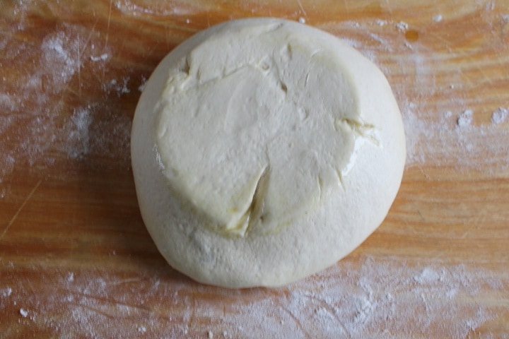 • Sie sollten einen gut verknoteten Teig erhalten, der etwas klebrig ist, wie auf dem Foto. Wenn er zu trocken ist, fügen Sie etwas Wasser hinzu, ist er zu flüssig, dann etwas Mehl.
