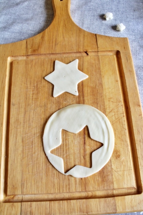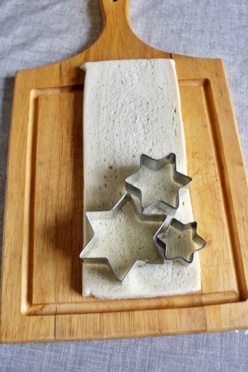 • Zuerst nehmt ihr die Scheiben Brot vorsichtig aus der Packung, legt sie auf ein Schneidebrett und stecht mit 3 unterschiedlich großen Stern-Ausstechern die Sterne aus.