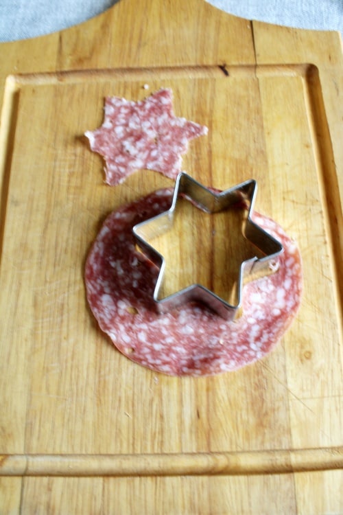 • Dann schneidet ihr die Sterne aus den Scheiben Salami. Drückt den Ausstecher fest an und hebt vor dem Entfernen den überschüssigen Teil, der außerhalb der Form liegt, an: Auf diese Weise erhaltet ihr präzise Formen. Wenn es nicht ausreicht, könnt ihr mit einem scharfen Messer nachhelfen.