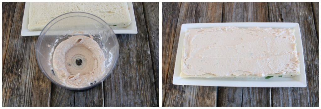 • Deckeln Sie die gesamte Oberfläche und die Seiten mit der restlichen Käsecreme, indem Sie mit einer Gabel glätten. Wenn Sie es glatter möchten, fügen Sie einen Esslöffel Mayonnaise hinzu und mischen Sie, dann verstreichen Sie es auf der Torte.