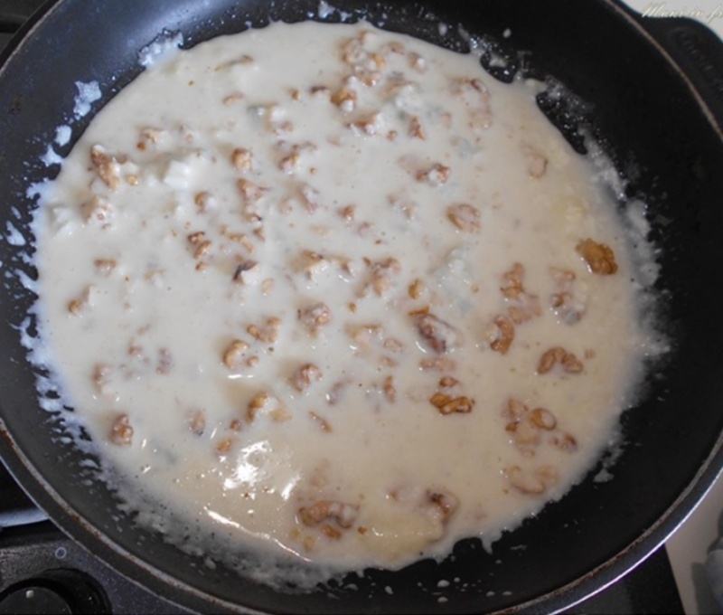 Fügen Sie Milch oder Sahne hinzu (je nach Vorliebe), und wenn der Käse geschmolzen und gut mit der Sahne (oder der Milch) vermischt ist, fügen Sie die Walnüsse hinzu.