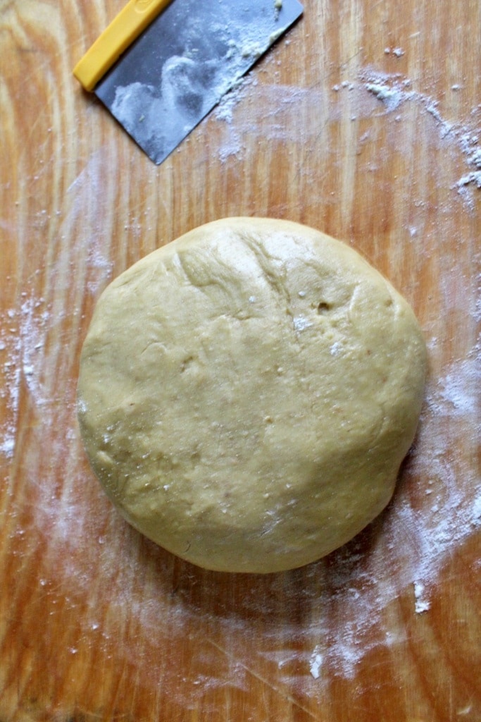 Den Teig auf einer bemehlten Arbeitsfläche kneten, bis ein Teigballen entsteht. Mit Frischhaltefolie abdecken und mindestens eine Stunde im Kühlschrank ruhen lassen. Ich habe es über Nacht gelassen, aus organisatorischen Gründen.