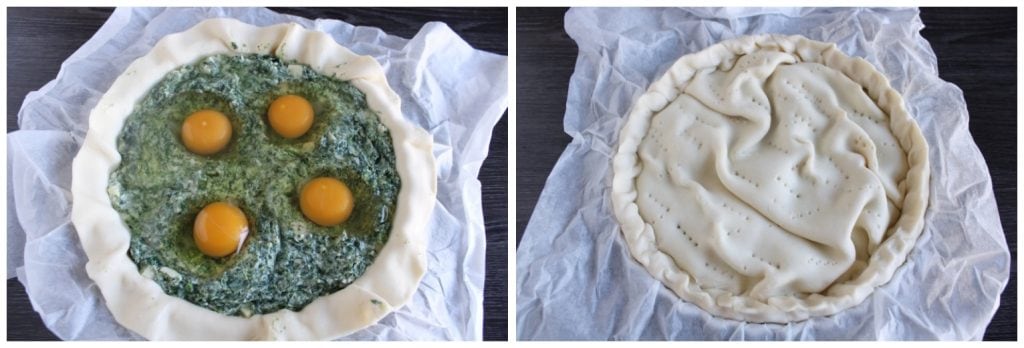 Dann die Blätterteigrolle ausrollen und mit ihrem Papier in eine hohe Backform (22 – 24 cm) legen. Den Boden mit einer Gabel einstechen, dann die Mischung aus Ricotta und Spinat hineingeben: Mit einem Löffel vier Vertiefungen für die Eier formen.