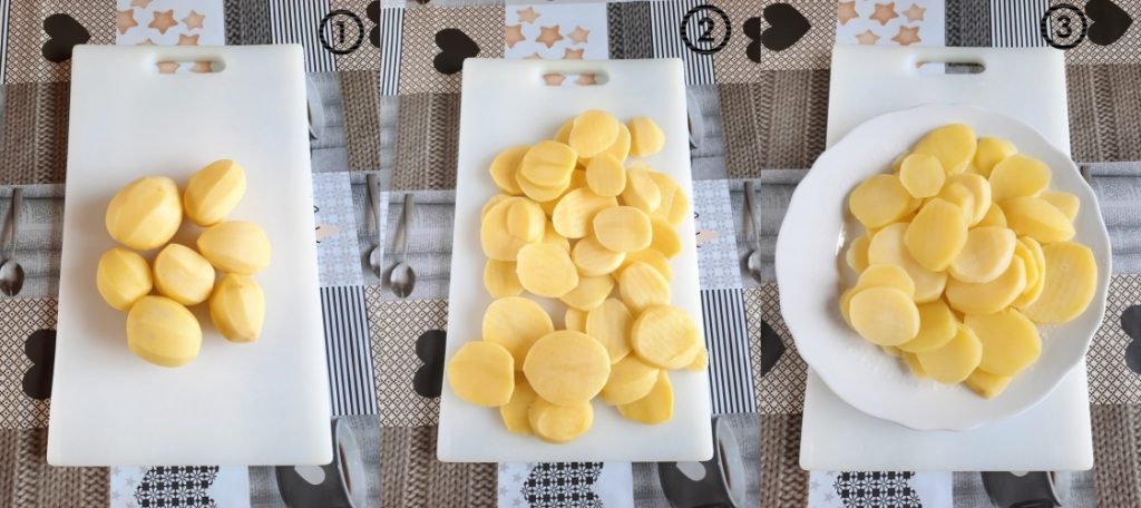 • Zuerst die Kartoffeln schälen (1). Unter fließendem Wasser abspülen, mit einem Tuch abtrocknen und mit einem scharfen Messer in dünne Scheiben schneiden (2). In kochendem Wasser für ein paar Minuten vorkochen (ca. 5 Minuten). Abseihen und abkühlen lassen (3).