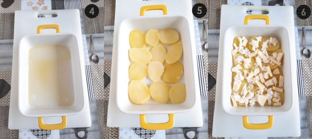 • Eine Auflaufform einfetten (4) mit extra natives Olivenöl (es geht auch normales Olivenöl). Die Kartoffelscheiben in die Auflaufform schichten (5), salzen, mit Öl beträufeln und 1/3 des gewürfelten Käses (6) und den geriebenen Parmesankäse hinzufügen.