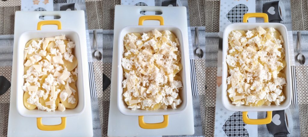 • Mit einer weiteren Schicht Kartoffeln abdecken und fortfahren, bis der Käse aufgebraucht ist. Insgesamt habe ich 3 Schichten gemacht.