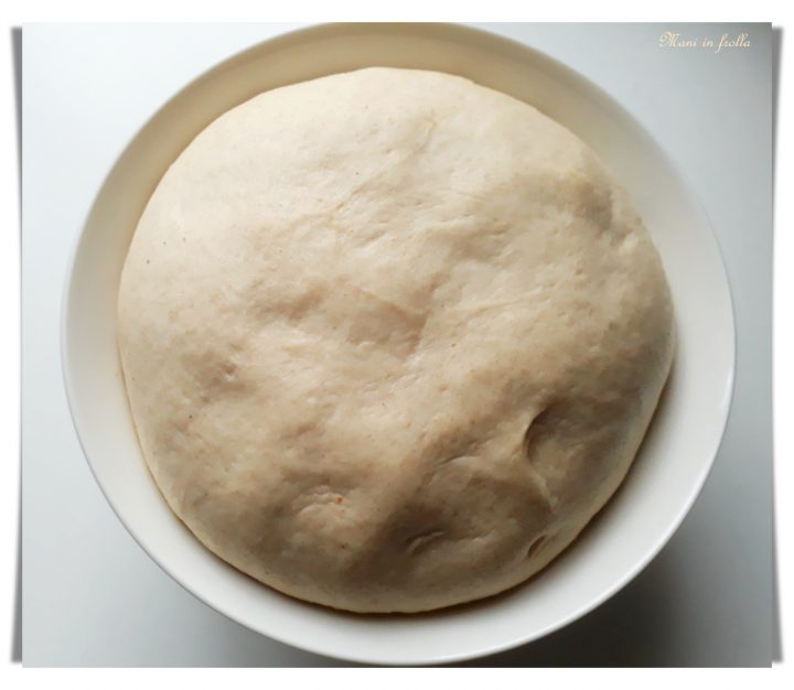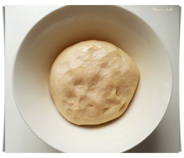 Jetzt den Teig aus der Küchenmaschine nehmen und einen Laib formen, den Sie in einer leicht geölten Schüssel etwa 2 Stunden ruhen lassen. Wenn die Außentemperatur ziemlich niedrig ist, stellen Sie die Schüssel in den ausgeschalteten Ofen mit eingeschaltetem Licht.