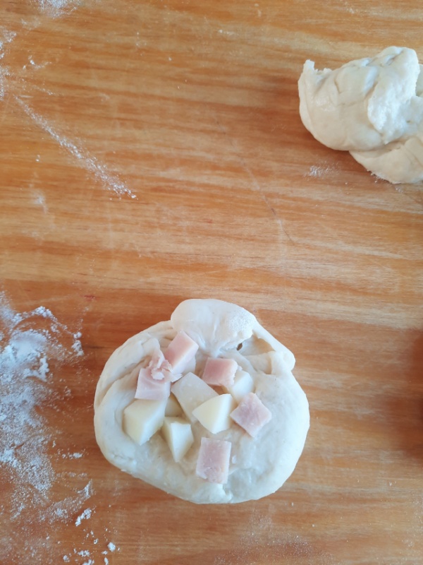 Ich habe mich für die salzige Version entschieden. Die Zubereitung ist sehr einfach. Ich habe den Teig vorbereitet, ihn etwa zwei Stunden gehen lassen, dann in kleine Kugeln geteilt, diese mit Käse- und Schinkenwürfeln gefüllt und gebacken. Was die Füllung betrifft, können Sie Ihrer Fantasie freien Lauf lassen und den Käse oder Aufschnitt verwenden, den Sie am liebsten mögen, Anchovis, Gemüse… Egal, wie Sie es machen, es ist lecker!