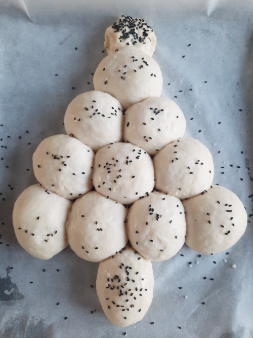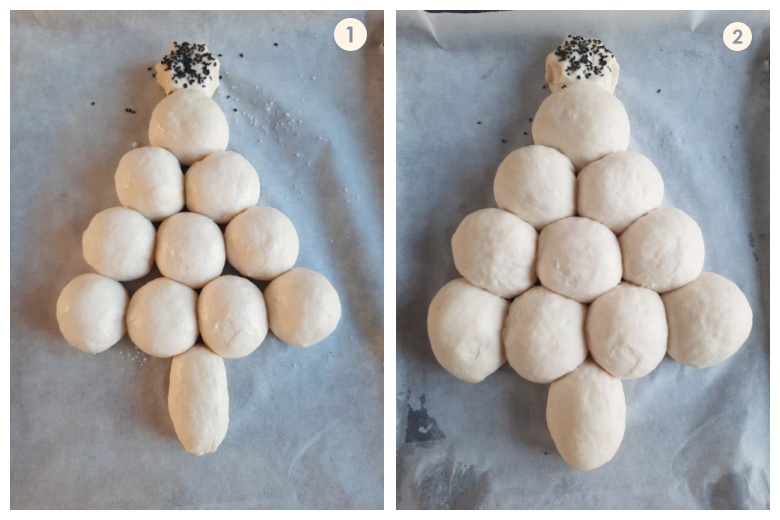 Schließen Sie sie, indem Sie sie mit den Fingern zusammendrücken, sodass der Verschluss unten ist, und legen Sie sie nach und nach auf das Backblech, um einen Baum zu formen (für den endgültigen Stamm habe ich eine Kugel leicht verlängert).