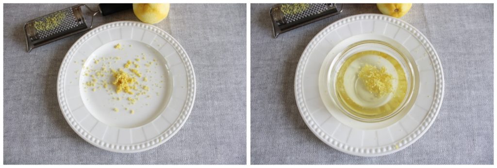 In der Zwischenzeit die Zitrone waschen und abtrocknen, abreiben (ohne das bittere Weiße zu erreichen) und in eine kleine Schüssel mit dem Öl geben und etwa 20 Sekunden in der Mikrowelle erhitzen: Dieser Schritt intensiviert das Aroma des Öls, damit der Kuchen den Zitronengeschmack optimal hervorhebt. Abkühlen lassen.