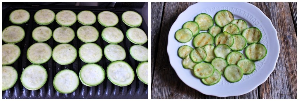 Zuerst die Zucchini waschen, die Enden abschneiden und mit einem Gemüsehobel in dünne Scheiben schneiden. Auf beiden Seiten auf einer Grillplatte oder im Grill grillen, bis sie schön goldbraun sind.