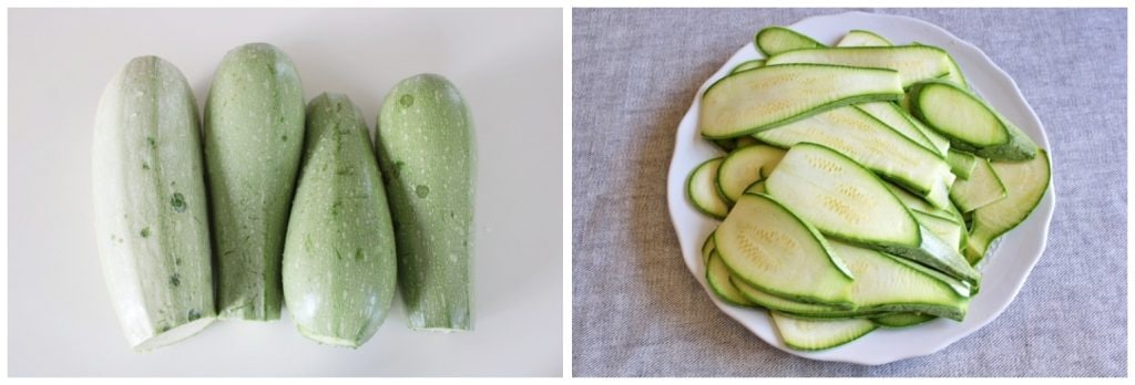 • Zuerst die Zucchini waschen und die Enden abschneiden; dann mit einem Gemüsehobel (oder einem Allesschneider) längs schneiden auf eine Dicke von etwa 3 mm, dann eine Schicht in einem Sieb legen und mit feinem Salz bestreuen, dann eine weitere Schicht und Salz daraufgeben und so weiter. Einen Teller ganz oben platzieren und einen Topf mit Wasser als Gewicht darauf legen: Dies hilft, einen Großteil des Wassers zu entfernen.