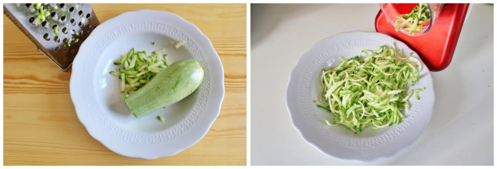 • Dann die Zucchini waschen und die Enden abschneiden; anschließend mit einer Raspel mit halbgroßen Löchern oder mit einem Gemüsehobel (praktisch und schnell, ohne Anstrengung) reiben und in ein Sieb oder einen Durchschlag zum Abtropfen geben.