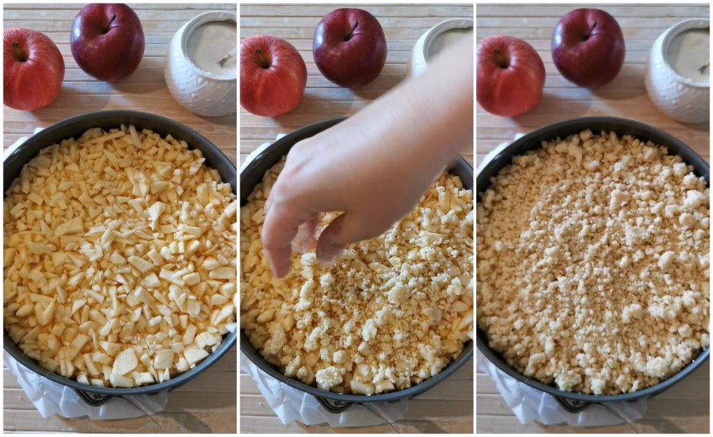 Den beiseite gelegten krümeligen Teig nehmen und die ganze Oberfläche abdecken.