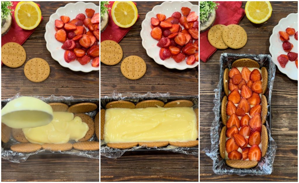 • Wenn du möchtest, kannst du eine weitere Keksschicht in der Mitte realisieren, genau nachdem du die Sahne- und Erdbeerschicht erstellt hast, so dass du beim Schneiden auch eine Schicht in der Mitte siehst.