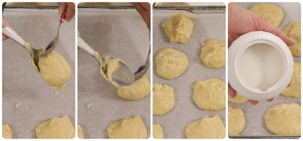 • Lassen Sie ihn mit einem anderen Löffel auf ein mit Backpapier ausgelegtes Backblech gleiten.