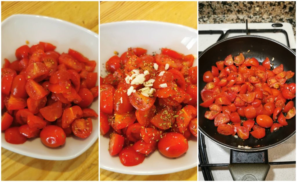 In der Zwischenzeit die Kirschtomaten waschen und halbieren oder vierteln. Nur mit Salz, Oregano oder frischem Basilikum und etwas gehacktem Knoblauch würzen.