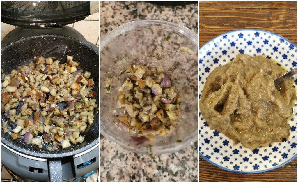 Sobald sie fertig sind, beiseite stellen. Nach der Ruhezeit die Auberginen garen. Wer keine Heißluftfritteuse hat, kann sie in der Pfanne mit etwas Öl garen.