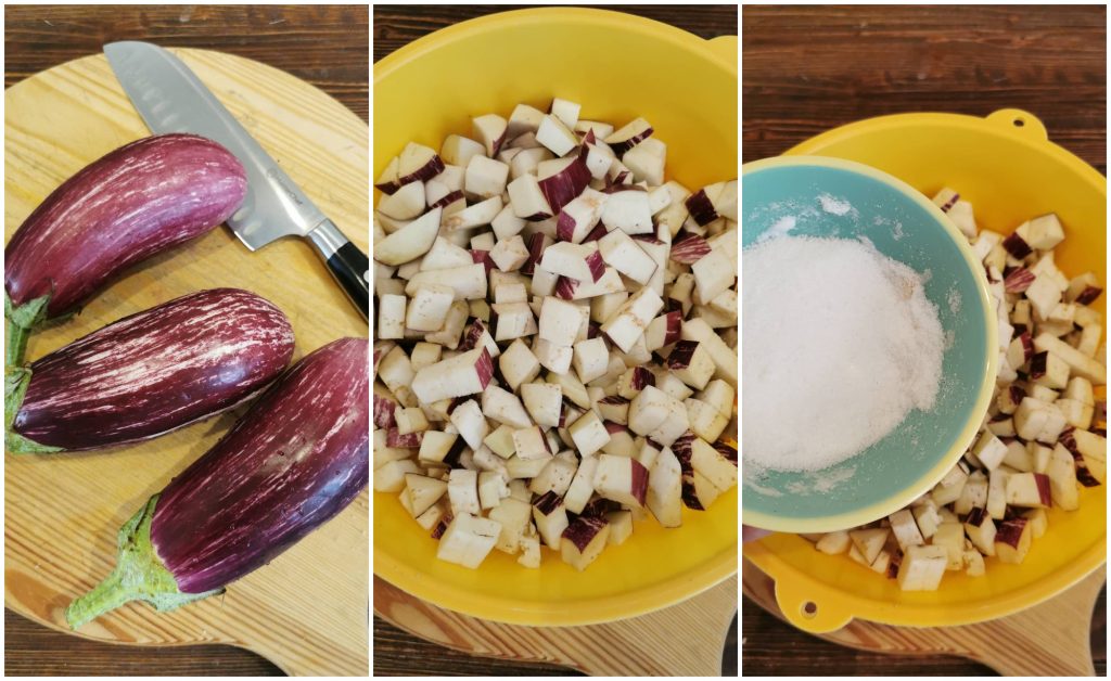 Zuerst die Auberginen waschen und in Stücke schneiden. In ein Sieb geben, salzen und ein paar Stunden ruhen lassen.