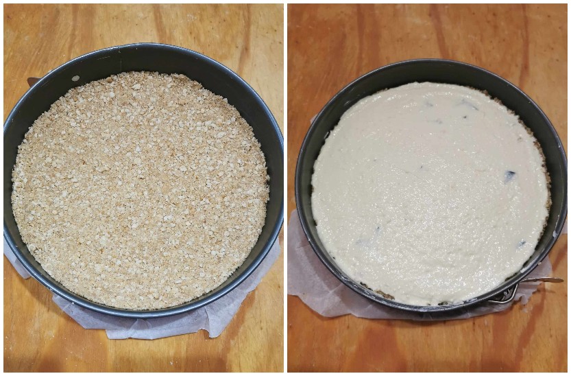 • Die Füllung ist fertig! Jetzt die Basis aus dem Kühlschrank nehmen und alles in die Form gießen.