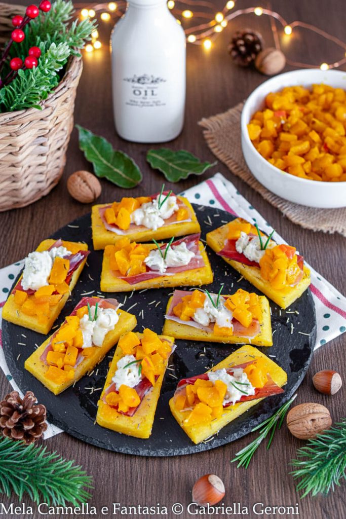 Polentaschnitten mit Kürbis, Speck und Gorgonzola