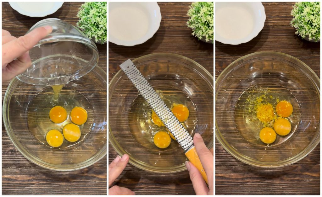 In einer Schüssel die mittelgroßen, ganzen Eier aufschlagen. Die abgeriebene Schale einer bio und gut gewaschenen Zitrone hinzufügen.