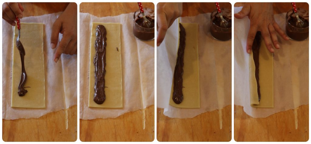 Entlang des Randes (nur auf einer Seite) mit etwas Nutella füllen, aber nicht übertreiben!