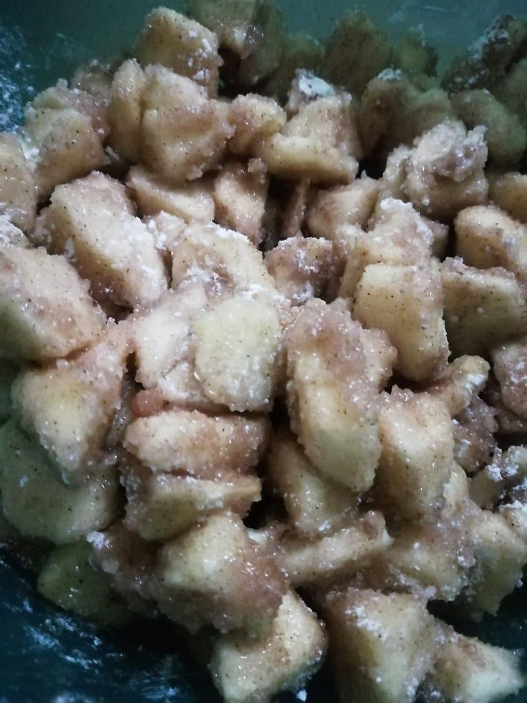 • In der Zwischenzeit schält und entkernt ihr die Äpfel, schneidet sie in kleine Würfel und gebt sie in eine Schüssel zusammen mit dem Zucker, dem Mehl und dem Zimt.