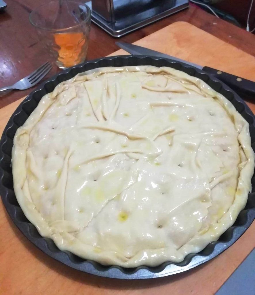 • Bedecken Sie die Füllung mit einer Schicht Blätterteig, ebenfalls zufällig und ohne sie zu sehr zu ziehen.