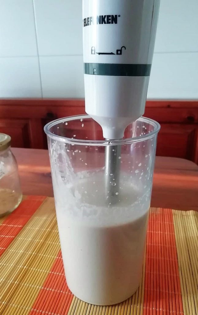 Nach der Einweichzeit gebt alle Zutaten in den Behälter des Stabmixers und püriert sie mindestens 4 Minuten.