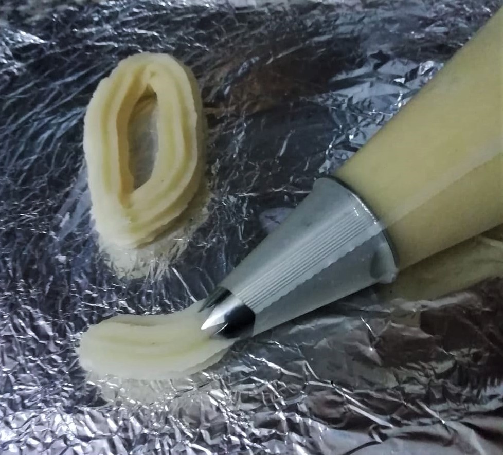 Wenn Sie keine spezielle Maschine für die Herstellung von Churros haben, keine Sorge, mit einem Silikon-Spritzbeutel und einer großen Sterntülle können Sie sie dennoch herstellen. Der Teig ist nicht sehr weich, daher müssen Sie den Teig leicht drücken, um sie zu formen, aber es ist ein Kinderspiel.