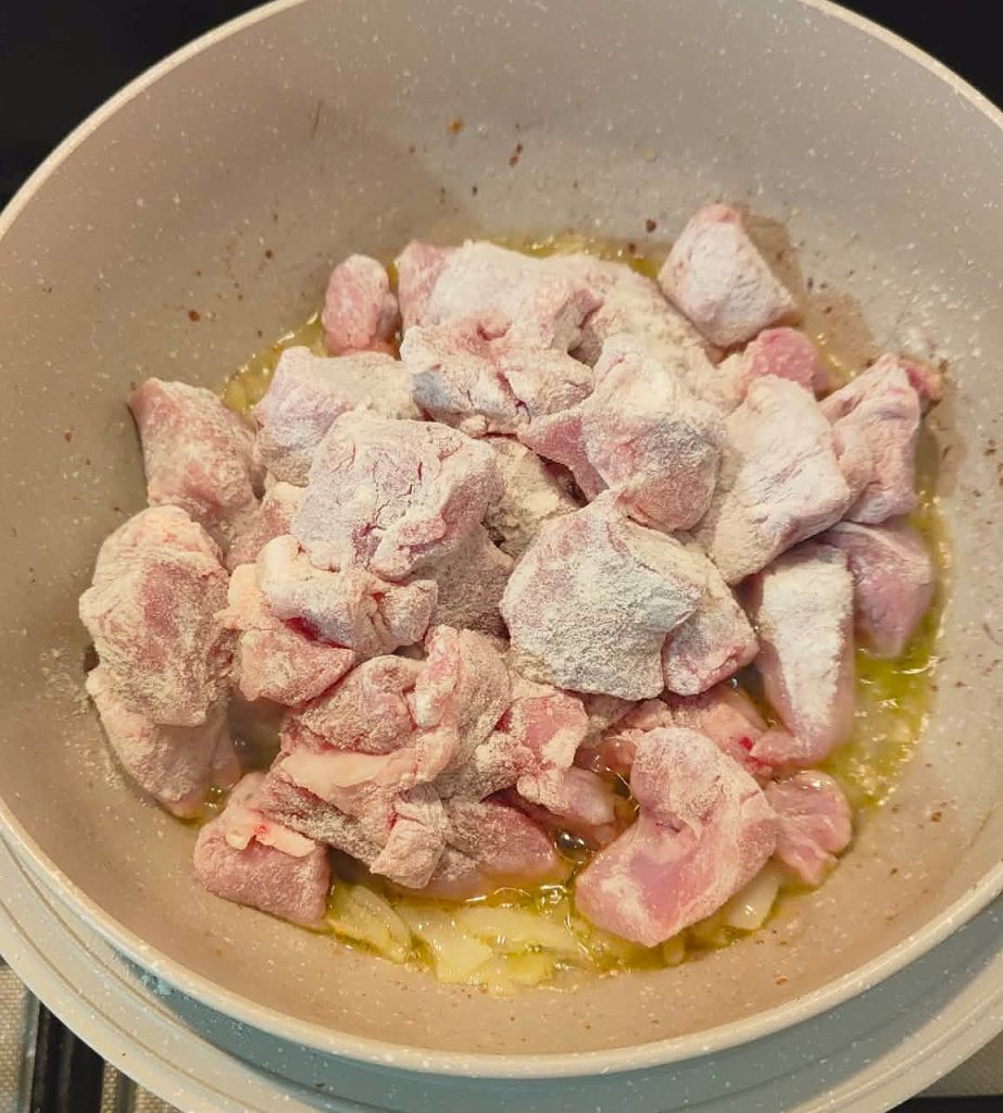7 – Rührt das Fleisch gut um, damit nichts anbrennt, und lasst es mit geschlossenem Deckel bei niedriger Hitze etwa 35–40 Minuten garen, dabei ab und zu umrühren.