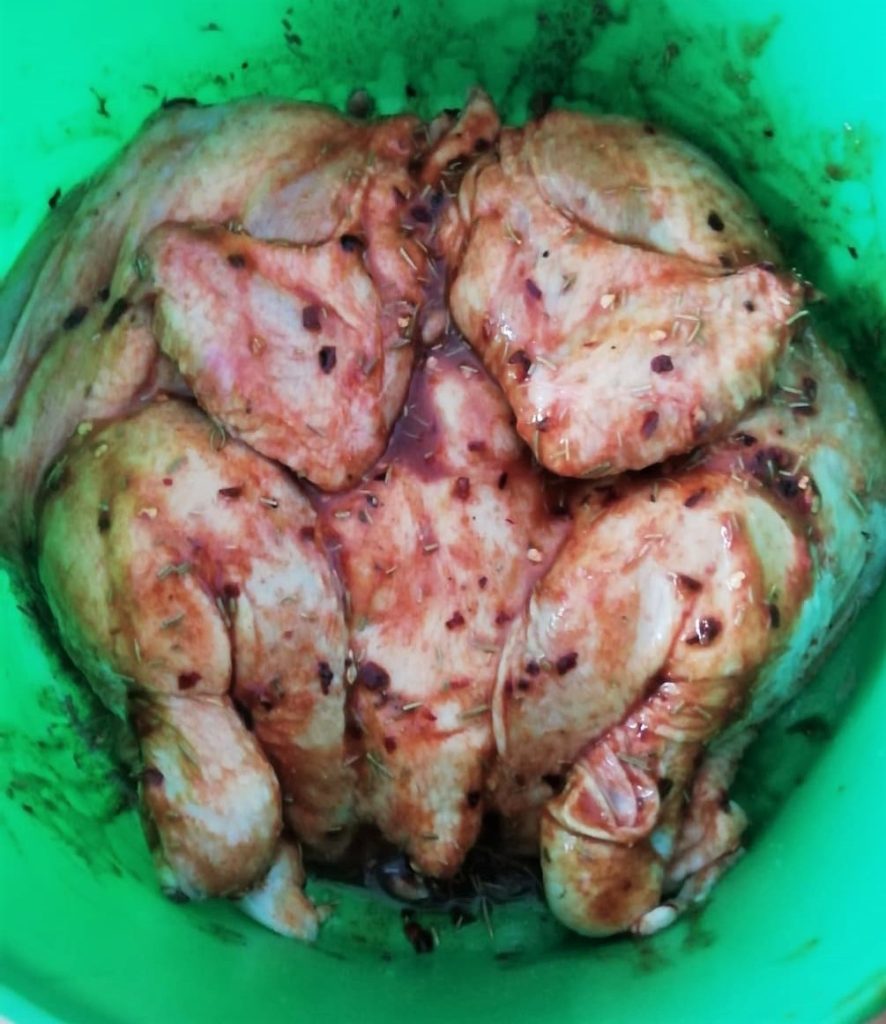 Zuerst schneiden Sie das Hähnchen in der Mitte entlang der Mittellinie, dann teilen Sie Schenkel und Brust in der Mitte. Sie können den Gaumen von 4/6 Personen verwöhnen, begleitet von einem frischen Salat der Saison.