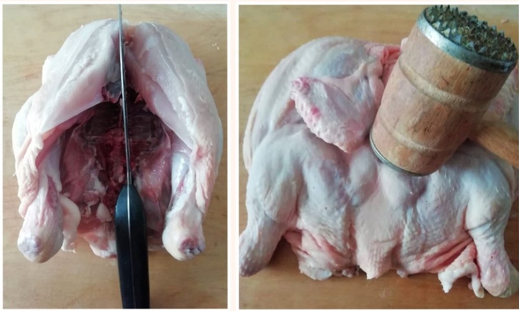 Waschen Sie das Hähnchen unter fließendem Wasser und trocknen Sie es mit Küchenpapier ab. Falls nötig, flambieren Sie die Federkiele auf der Haut. Legen Sie es auf die Arbeitsfläche und schneiden Sie es in der Mitte entlang des Brustbeins auf. Klappen Sie es auf und drehen Sie es mit der Hautseite nach oben um.
