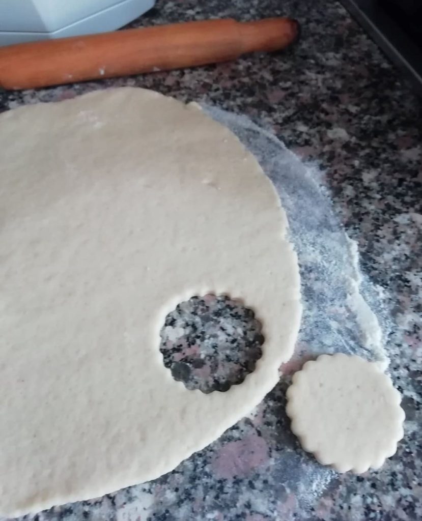 Die Mengen sind für 35 kleine Kekse mit Marmelade, ausgestochen mit einem Wellenschneider von 4,5 cm Durchmesser und einem weiteren kleinen Ausstecher für das zentrale Loch.