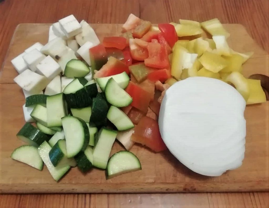Dann waschen und würfeln Sie auch die Paprika und die Zucchini.